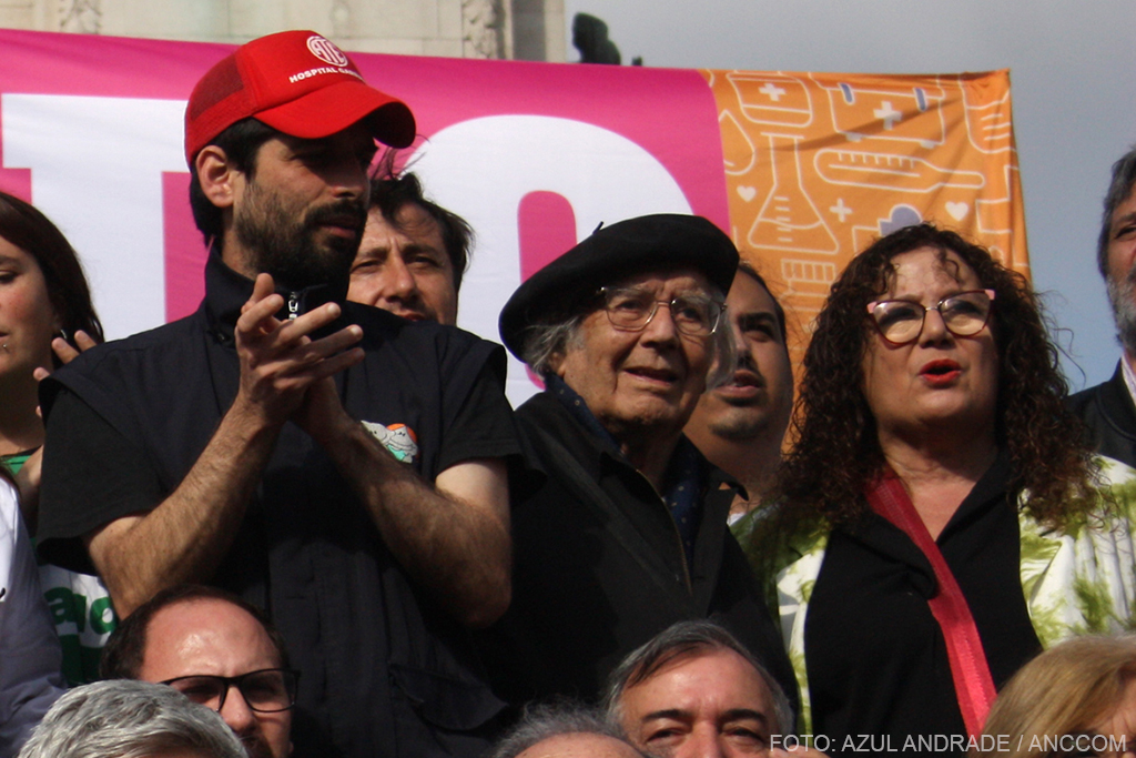 De cara a la marcha del próximo miércoles, este lunes la Asociación Civil y Gremial de Profesionales y Técnicos del Hospital Garrahan (APyT) realizó una conferencia de prensa y un cabildo abierto junto a distintas organizaciones sociales, frente al Congreso de la Nación. El Premio Nobel de la Paz Adolfo Pérez Esquivel estuvo presente y leyó entre vitoreos el comunicado que se preparó desde el hospital pediátrico: “Queremos plantearle a todos los diputados y senadores que aseguren con su voto el rechazo contundente a los vetos autoritarios del Presidente”.