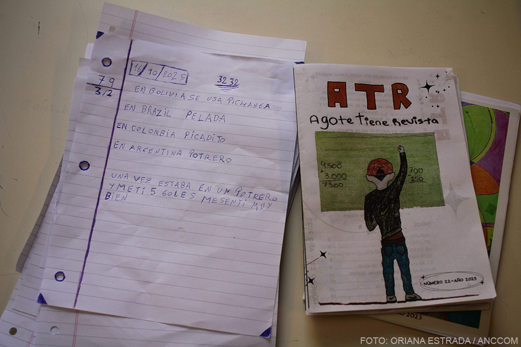 Aprovechando la incipiente pérdida de timidez, Acuña comenzó a desplegar una actividad preguntando por la palabra “potrero” mientras los y las docentes repartían hojas rayadas y lapiceras. Es que, luego de mencionar múltiples palabras equivalentes a “potrero” en distintos países de Latinoamérica, el escritor les pidió a los chicos que escribieran alguna frase utilizando esos vocablos. “En Bolivia, ‘pichanga’; en Brasil, ‘pelada’; en Costa Rica, ‘mejenga’; en Guatemala, ‘chamusca’; en México, ‘cascarita’ ”, leía Acuña mientras los jóvenes parecían debatirse internamente entre empezar a escribir o tratar de memorizar los múltiples modismos. “Jugar a la bocha. Hoy picado, ¿y mañana?” fue una de las producciones más celebradas entre los compañeros.