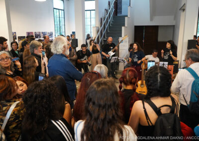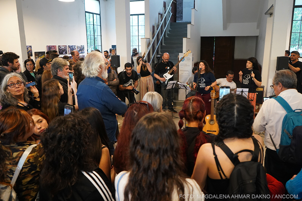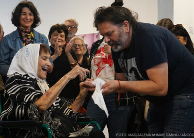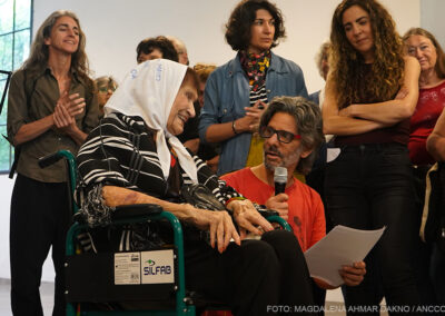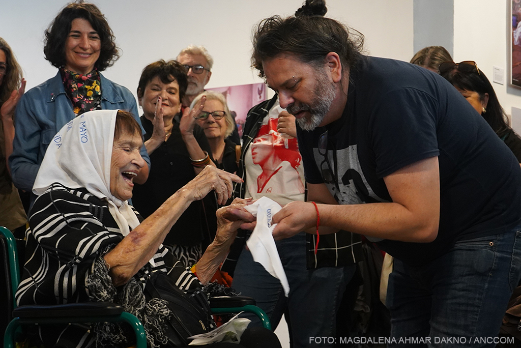El ritmo de la muestra cambia con la llegada de Taty Almeida, una de las pocas Madres que quedan. Recibida entre aplausos y flashes de cámaras profesionales y celulares, hace que, por un momento, todos los presentes se vuelvan fotógrafos, y la exposición pase a un segundo plano frente a su presencia. Al tomar la palabra, Taty recuerda a otra madre de Plaza de Mayo, Vera Jarach, recientemente fallecida, y agradece a ARGRA, a la vez que destaca que la fotografía es una de las mejores formas de seguir resistiendo. En sus manos sostiene un cartel pidiendo justicia por Pablo Grillo, fotoreportero herido durante una manifestación en marzo.