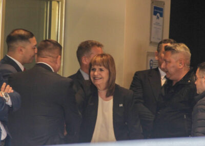 La primera oradora del escenario fue Patricia Bullrich, candidata a senadora, ganadora en la Ciudad de Buenos Aires con el 50,2%. La Ministra de Seguridad definió a la capital como “el motor del cambio”. “Lo importante es no retroceder”, sostuvo, y sobre los senadores que no responden ni al oficialismo ni al peronismo, aseguró: “Vamos a tener los brazos abiertos para construir mayoría”. “Hoy se dio un gran paso”, subrayó, mientras afuera la ovacionaban al grito de: “Pato sí, kukas no”.