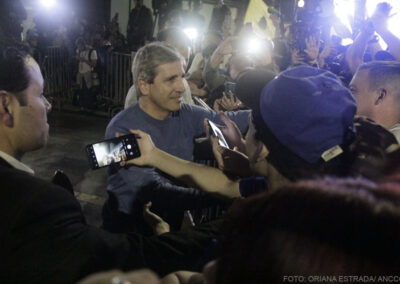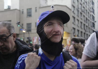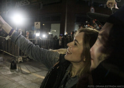 En la calle, el público fue llegando de a poco, alentado por los primeros boca de urna favorables. Finalmente, una multitud con banderas argentinas y amarillas, gorras rojas con la leyenda “Las Fuerzas del Cielo” y camperas violetas copó el lugar, mezclándose con la prensa. Un colectivero inició la celebración haciendo sonar la bocina cerca de las 20:30. Enseguida estalló la euforia, con cánticos, saltos y gritos a favor del gobierno. “Tira piedras, kuka tira piedras” y “Saquen al pingüino del cajón” fueron los más repetidos. También apuntaron contra Cristina Fernández de Kirchner: “Cristina tobillera” y “Sin Cristina, Argentina”. “Logramos otra domada. Por suerte existe gente del bien”, expresó Gonzalo, joven militante que sostenía la bandera con la serpiente y el lema libertario “Don’t tread on me” (“No pases sobre mí”).