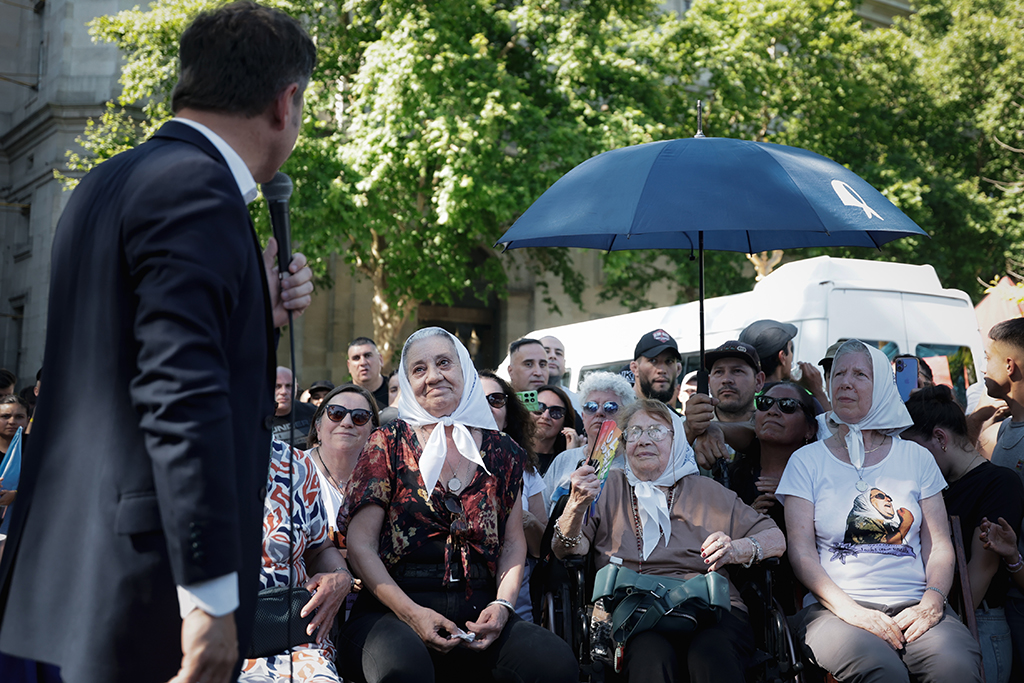 Después de las palabras de las Madres Josefa “Pina” de Fiore y Carmen Arias, el gobernador de la provincia de Buenos Aires, Axel Kicillof, tomó el micrófono para recordar a Hebe, mientras apuntó contra el gobierno de Javier Milei: “Hoy homenajeamos a la que siempre tenía la palabra justa, a la que nunca le temió a los poderes establecidos, a la que enfrentaba con su cuerpo, inteligencia y coraje a la dictadura militar. Y con Hebe, homenajeamos a quienes hoy vuelven a ser víctimas del intento de ninguneo y persecución que sufrieron en ese entonces. Decimos entonces que son 30.000 compañeros desaparecidos y que no va a venir ningún ignorante a discutir lo que en Argentina es una bandera para siempre”.