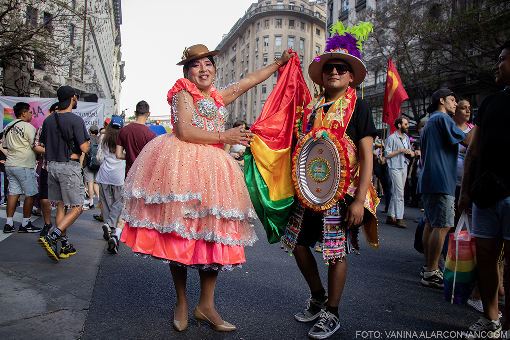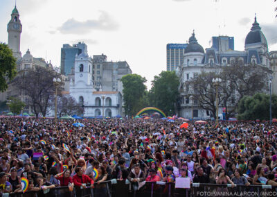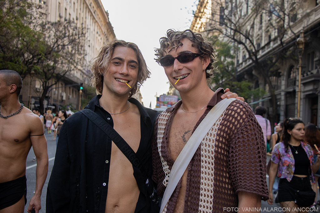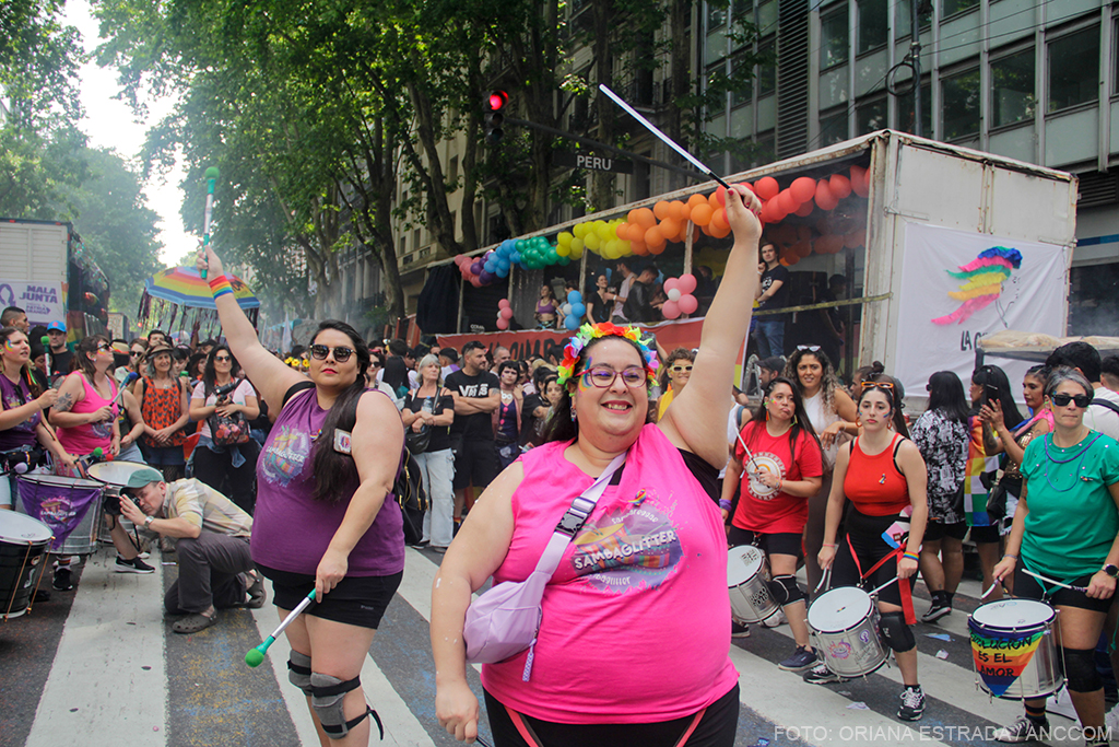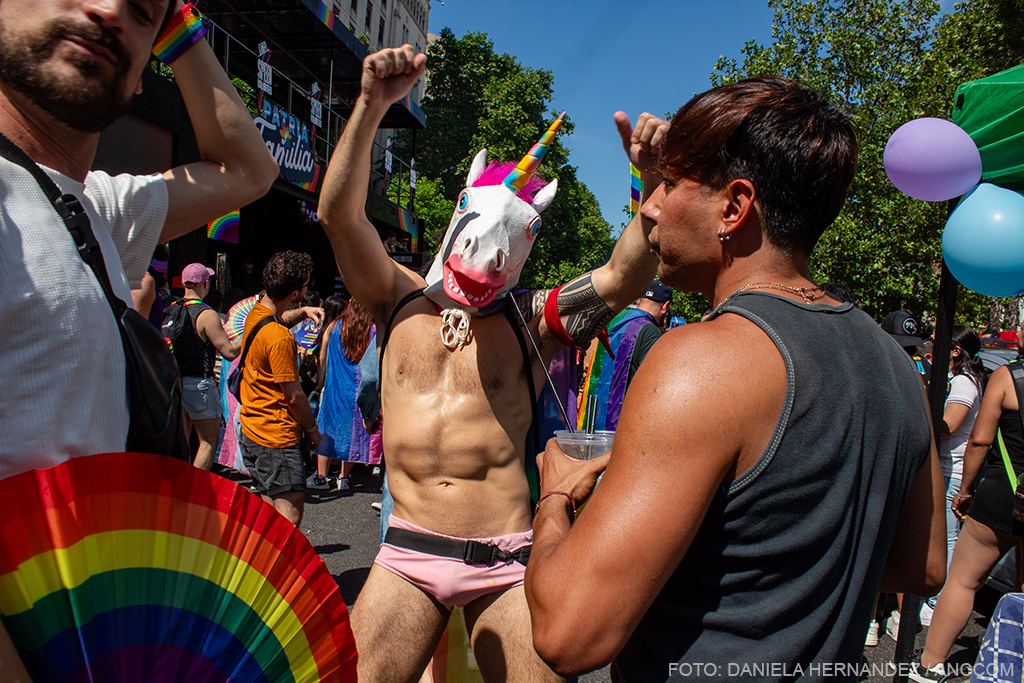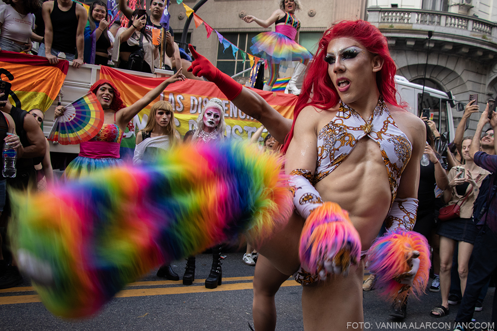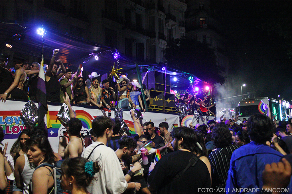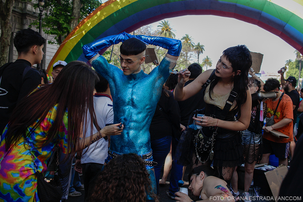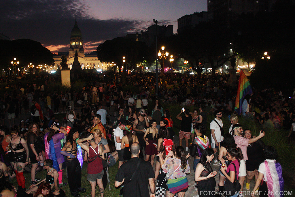 En las calles aledañas, el sonido de los parlantes es reemplazado por la potencia de los bombos de la murga y los cánticos de los concurrentes que inician la marcha hacia Plaza Congreso. Distintas carrozas decoradas con los colores del arcoíris avanzan junto a la multitud en un clima festivo. La gente canta el Himno Nacional, levanta las banderas del orgullo, baila y festeja, celebrando la libertad que otorga estar rodeado de personas que respetan cada identidad.