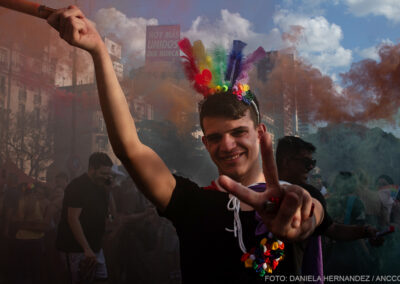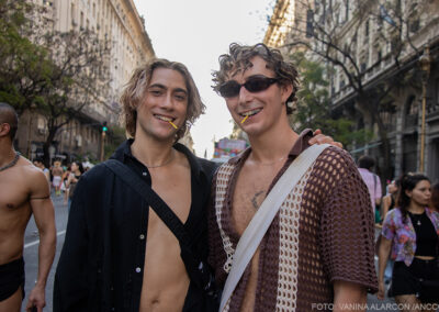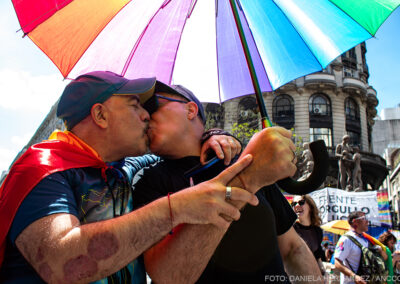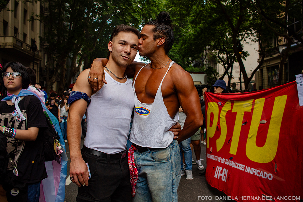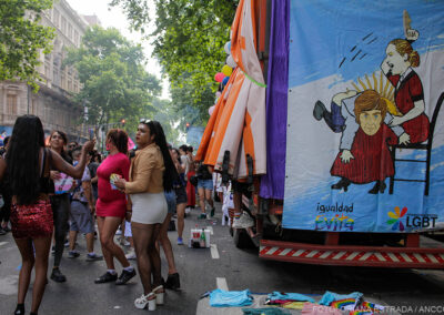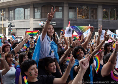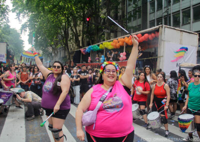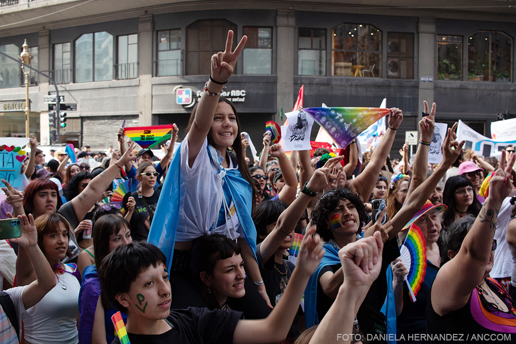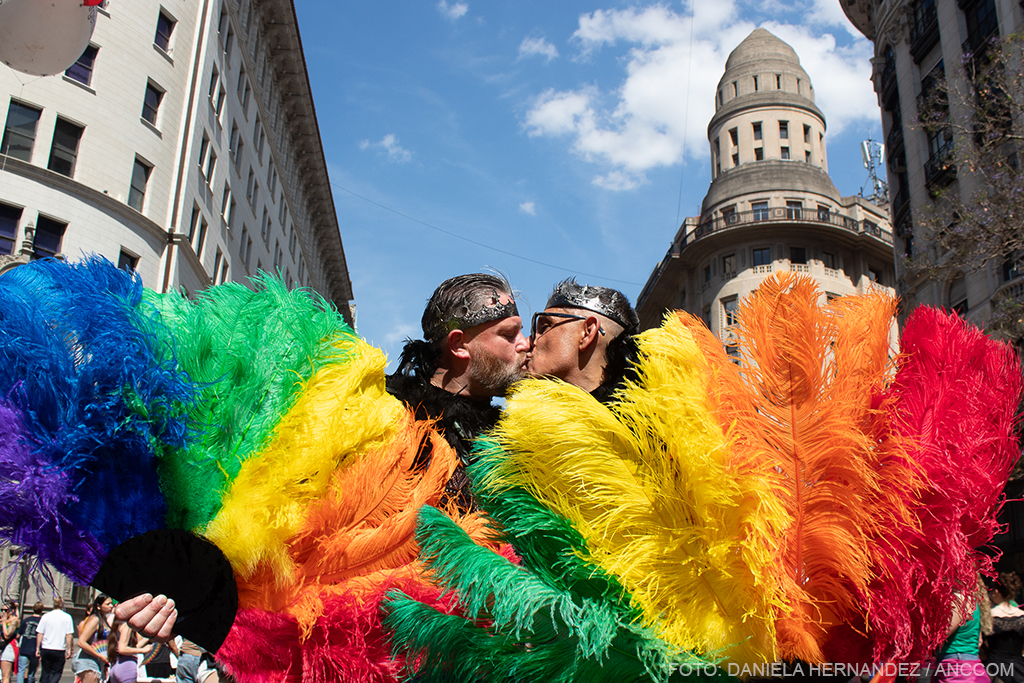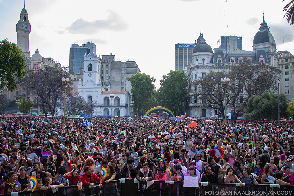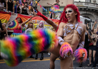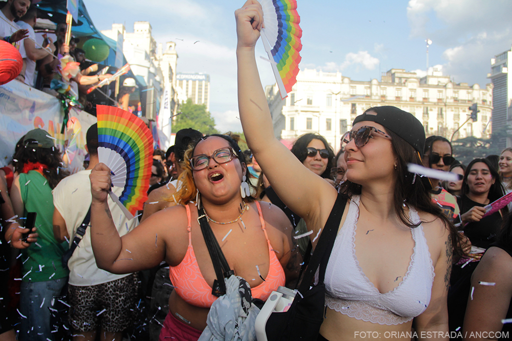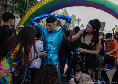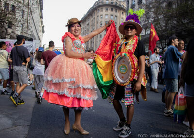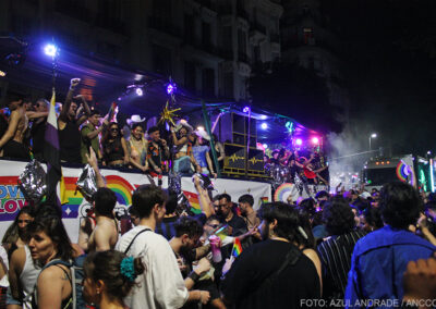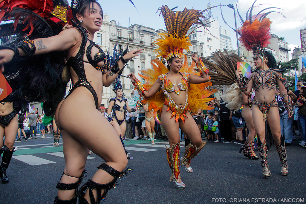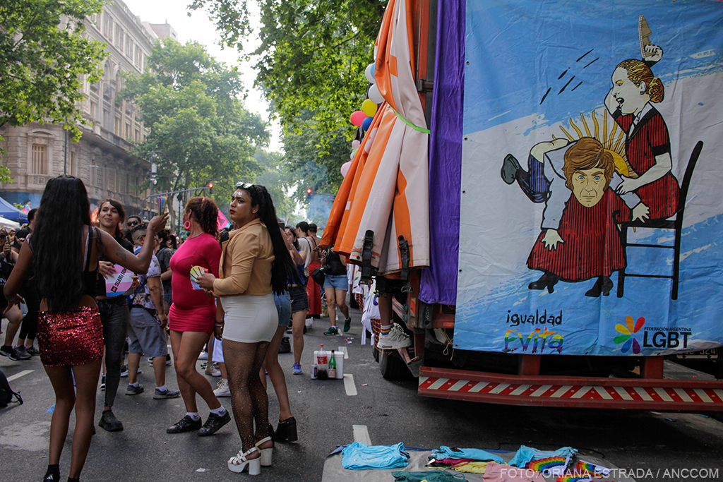 En las calles aledañas, el sonido de los parlantes es reemplazado por la potencia de los bombos de la murga y los cánticos de los concurrentes que inician la marcha hacia Plaza Congreso. Distintas carrozas decoradas con los colores del arcoíris avanzan junto a la multitud en un clima festivo. La gente canta el Himno Nacional, levanta las banderas del orgullo, baila y festeja, celebrando la libertad que otorga estar rodeado de personas que respetan cada identidad.
