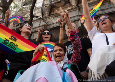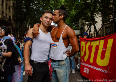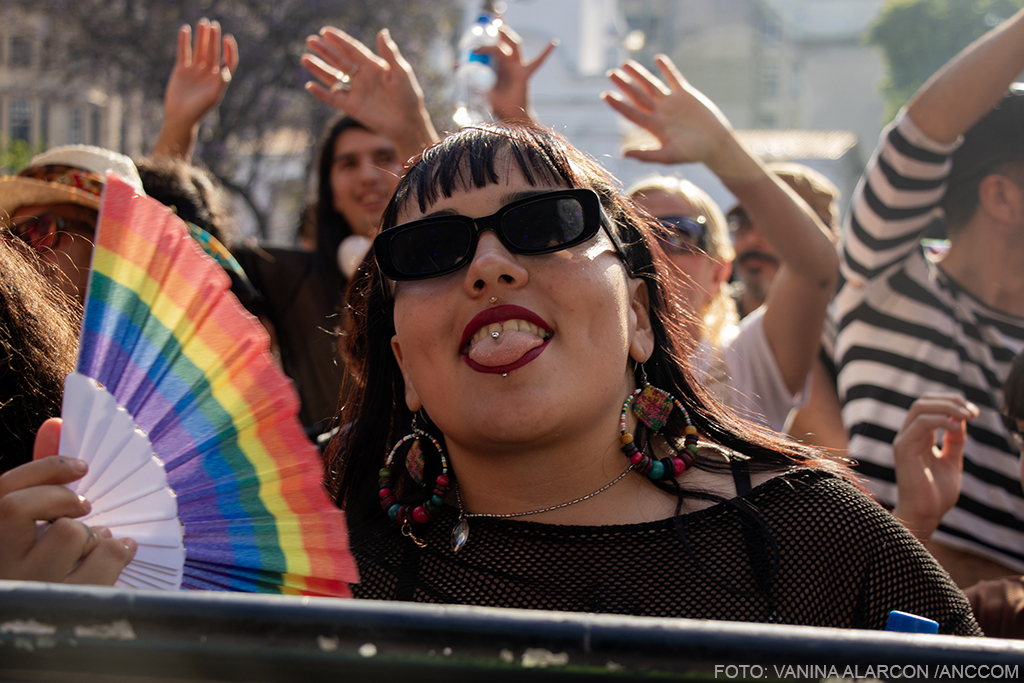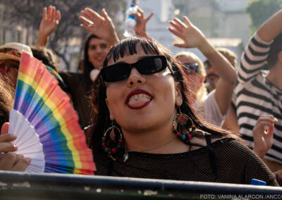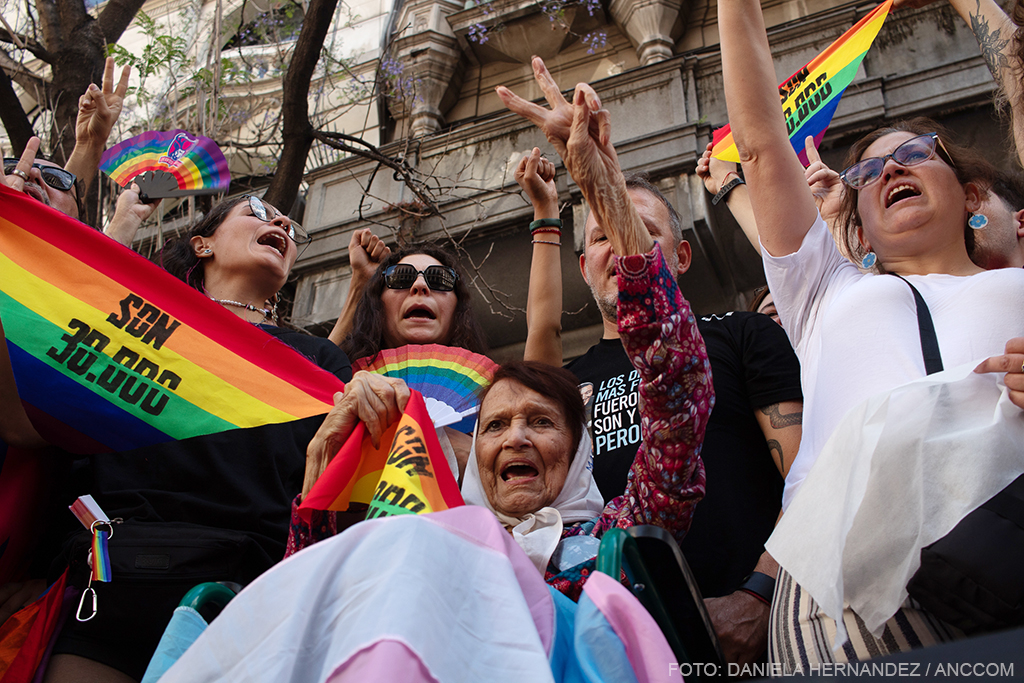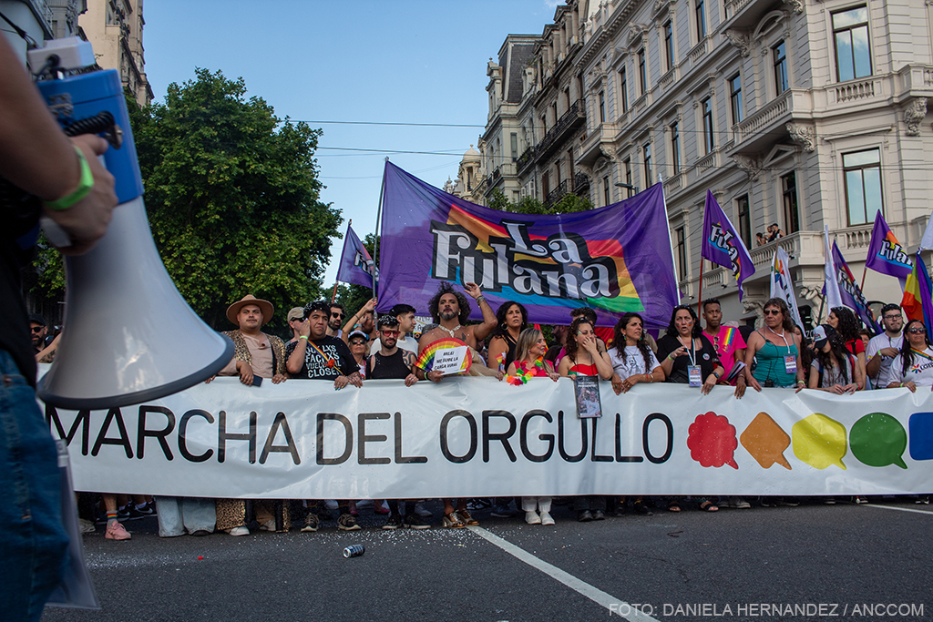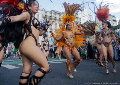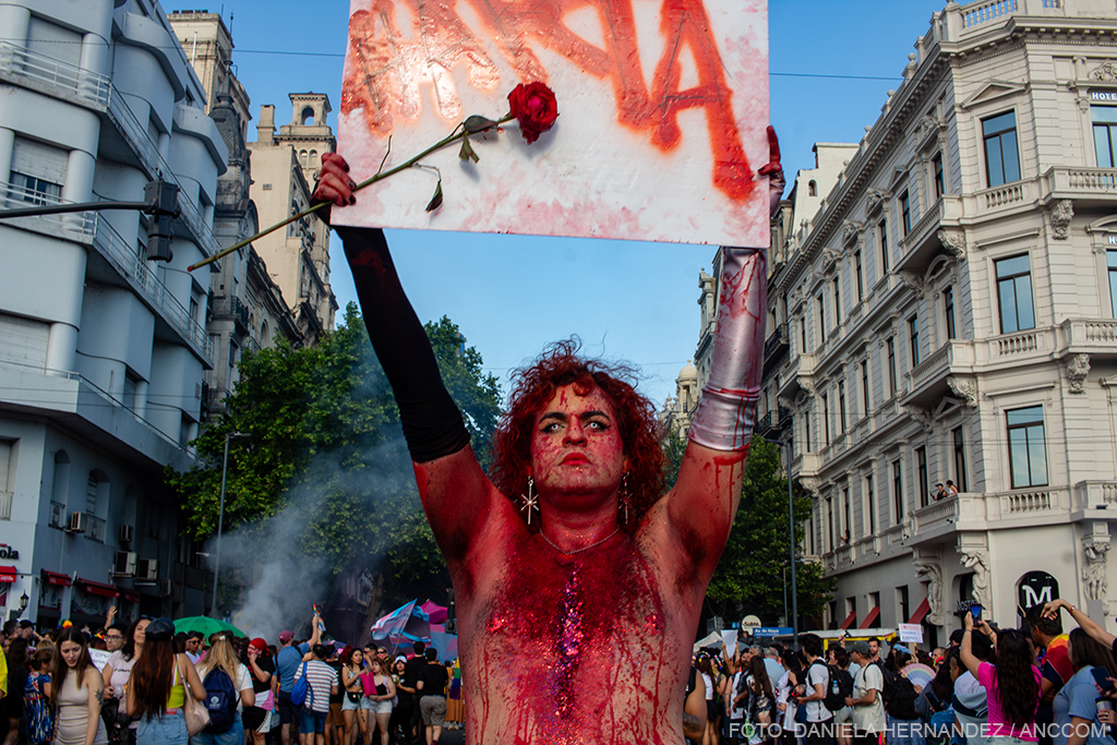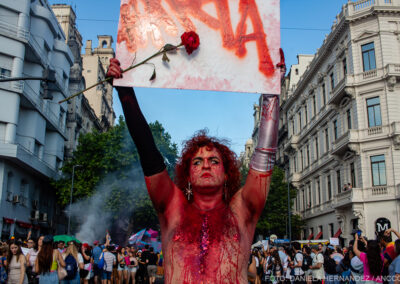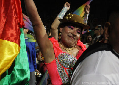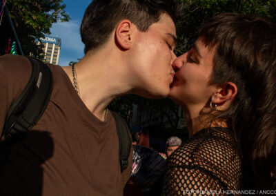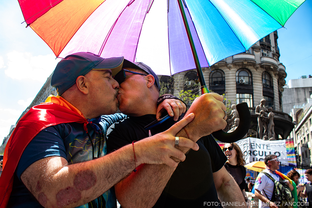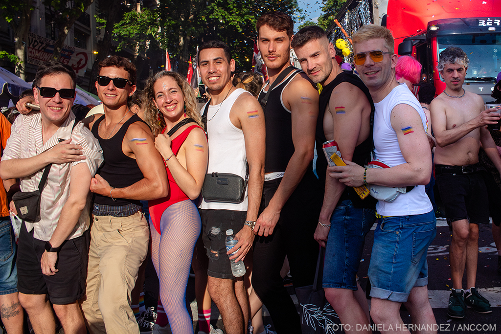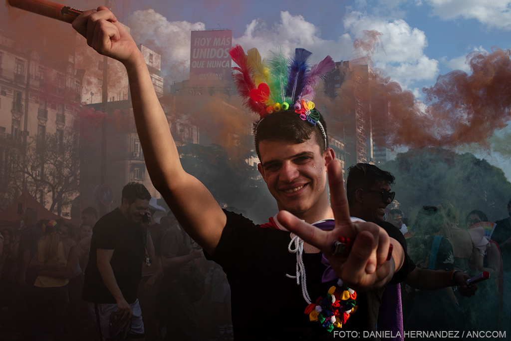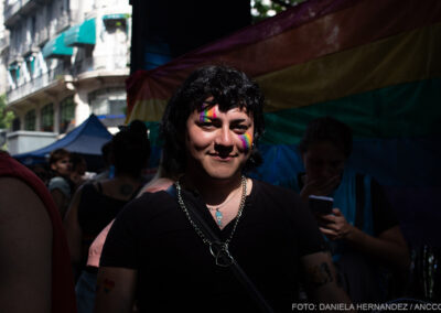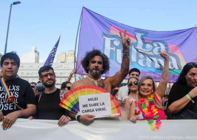 En las calles aledañas, el sonido de los parlantes es reemplazado por la potencia de los bombos de la murga y los cánticos de los concurrentes que inician la marcha hacia Plaza Congreso. Distintas carrozas decoradas con los colores del arcoíris avanzan junto a la multitud en un clima festivo. La gente canta el Himno Nacional, levanta las banderas del orgullo, baila y festeja, celebrando la libertad que otorga estar rodeado de personas que respetan cada identidad.