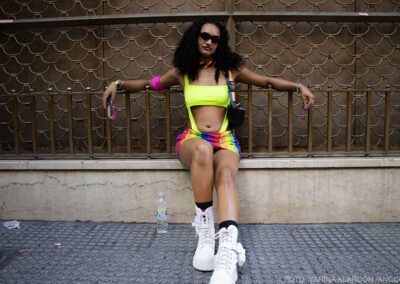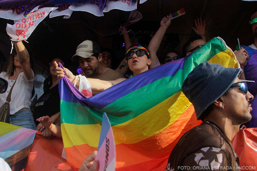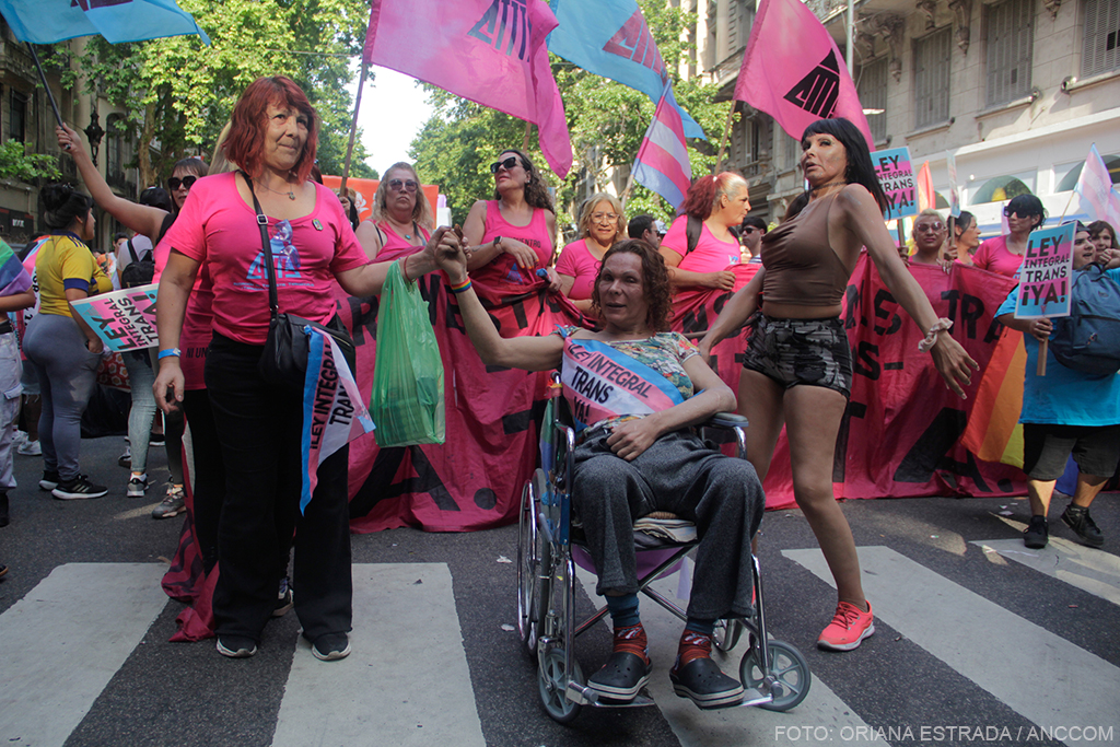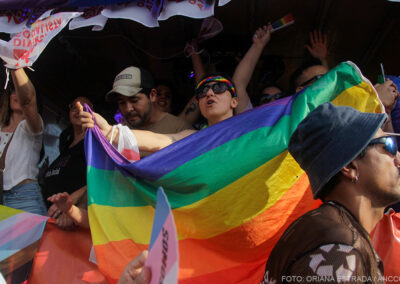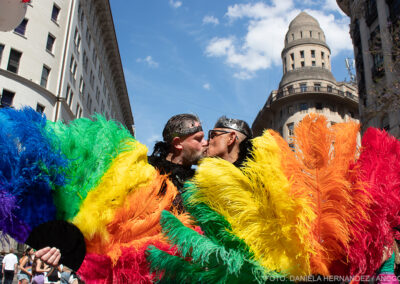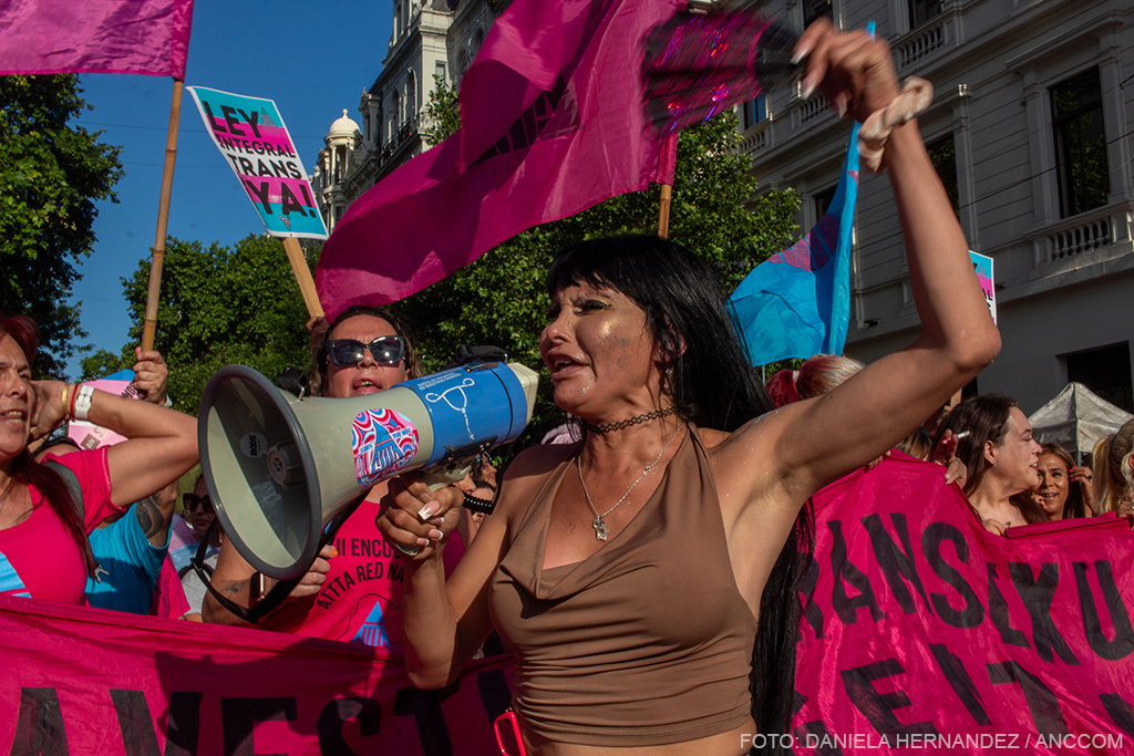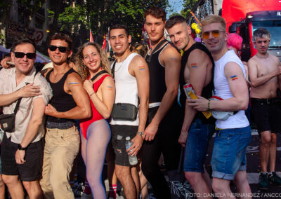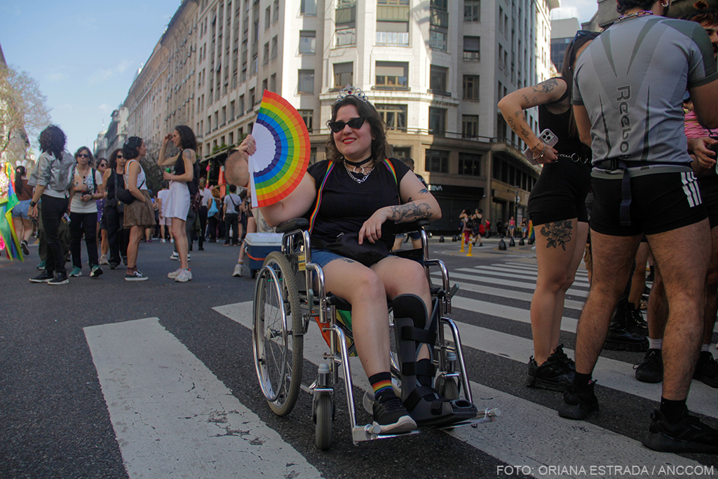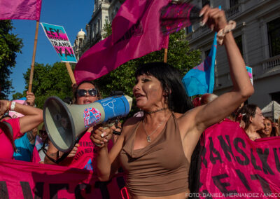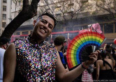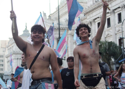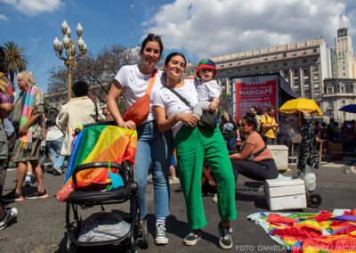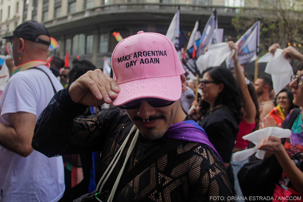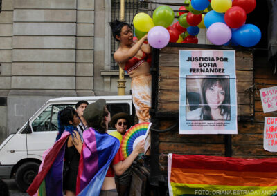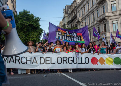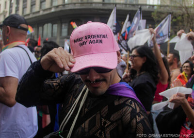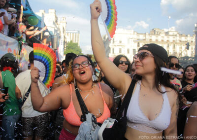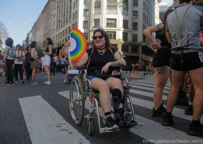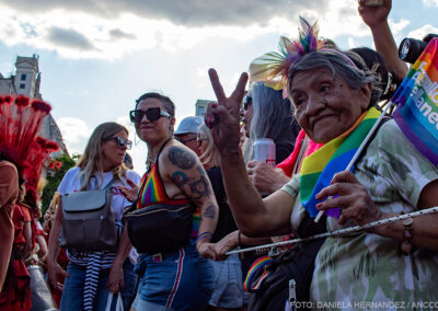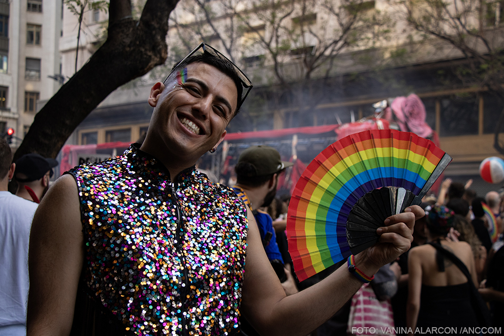 En las calles aledañas, el sonido de los parlantes es reemplazado por la potencia de los bombos de la murga y los cánticos de los concurrentes que inician la marcha hacia Plaza Congreso. Distintas carrozas decoradas con los colores del arcoíris avanzan junto a la multitud en un clima festivo. La gente canta el Himno Nacional, levanta las banderas del orgullo, baila y festeja, celebrando la libertad que otorga estar rodeado de personas que respetan cada identidad.