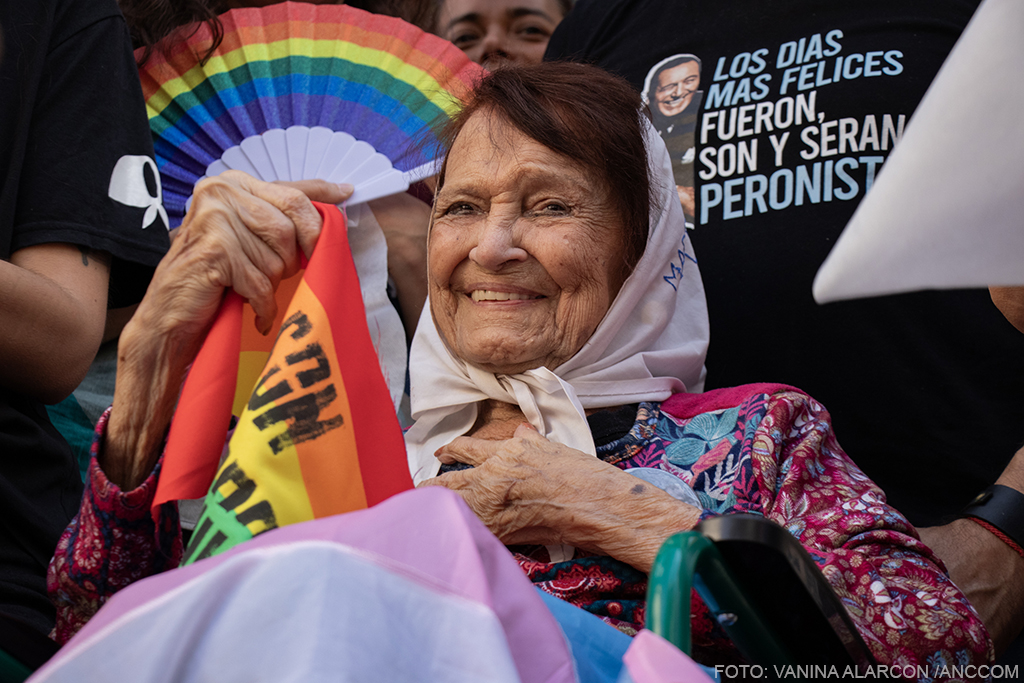 En otro escenario aparece Taty Almeida, de Madres de Plaza de Mayo, que levanta un pañuelo con los colores del arcoíris donde se lee ‘Son 30.000’. Sobre sus piernas descansa la bandera de la integración y, con una sonrisa, declara: «Estamos demostrando que la resistencia continúa, ¿saben por qué? porque no nos han vencido”. Al alzar los brazos, recibe una ovación de aplausos.