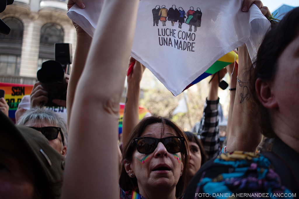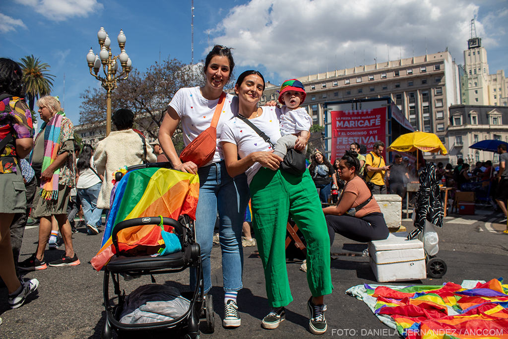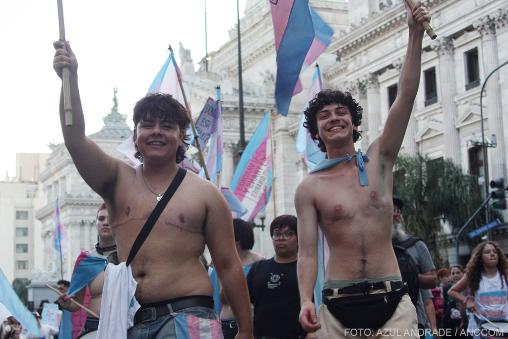 En medio de la multitud, bajo el sol del mediodía, una madre y su hijo caminan con un cartel que dice: «Las niñeces trans no son un debate», en sintonía con una de las consignas destacadas de la jornada, en contra de la estigmatización a las niñeces y adolescencias trans, y en reclamo por el acceso a hormonas e inhibidores.