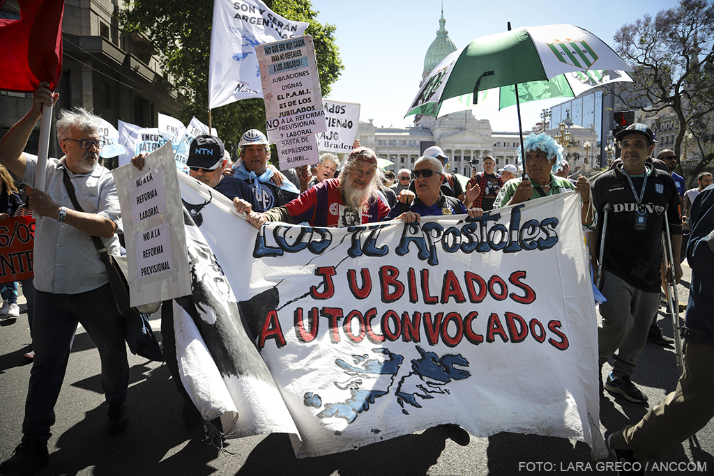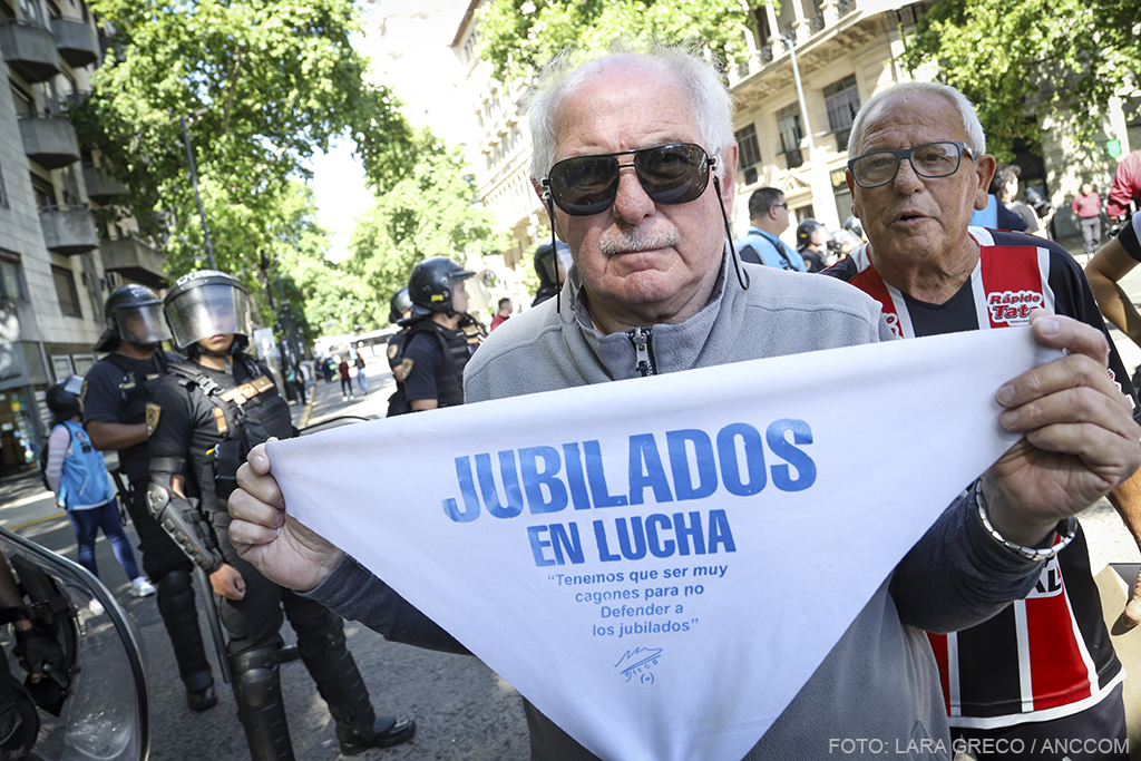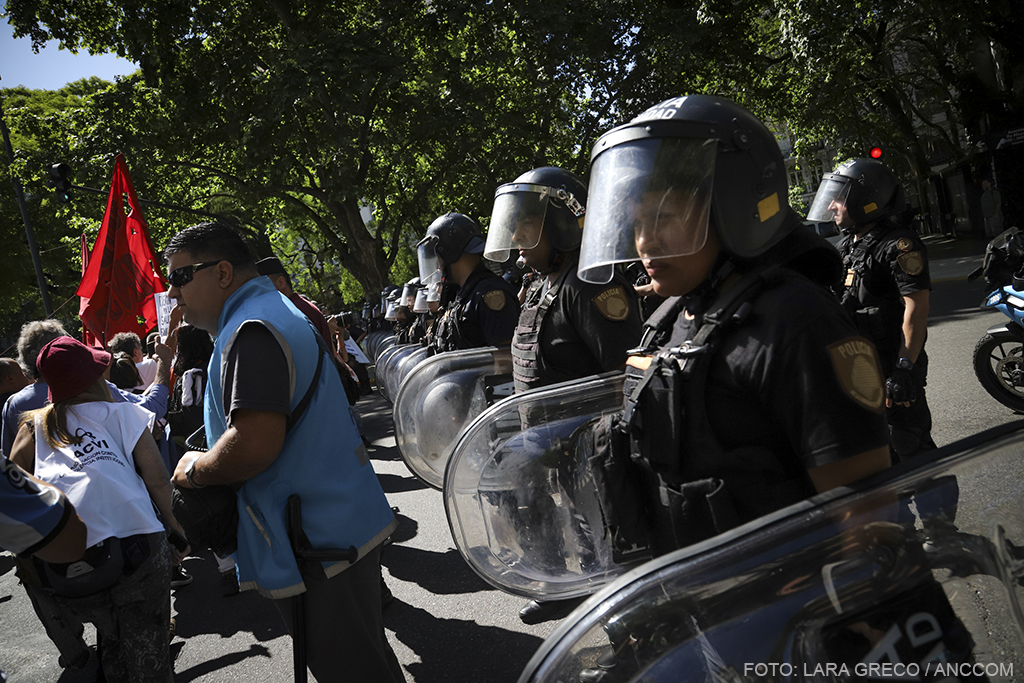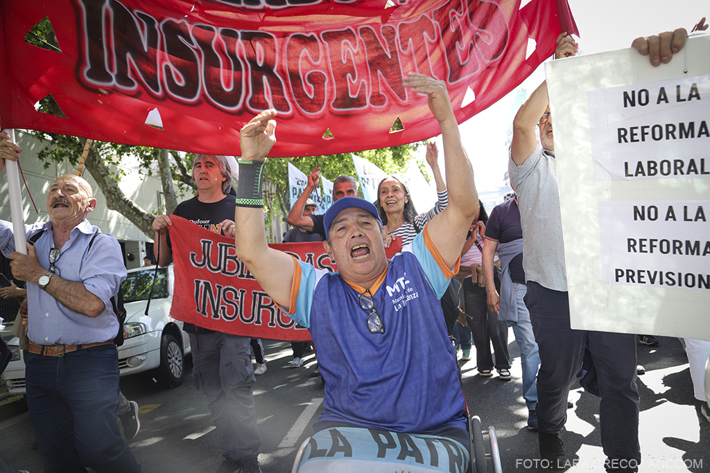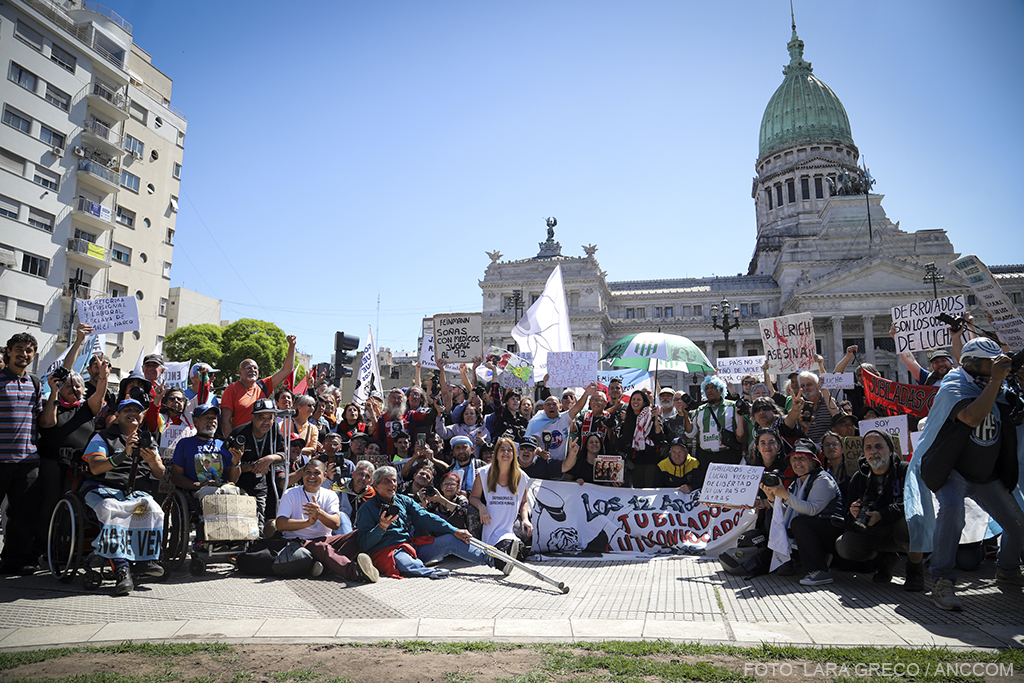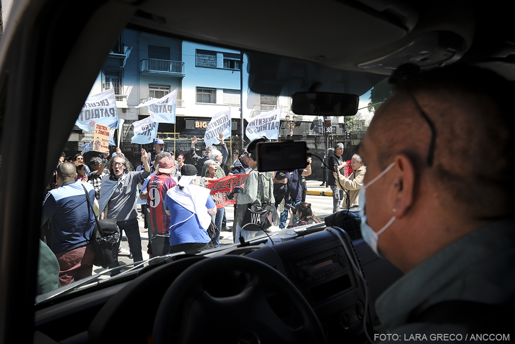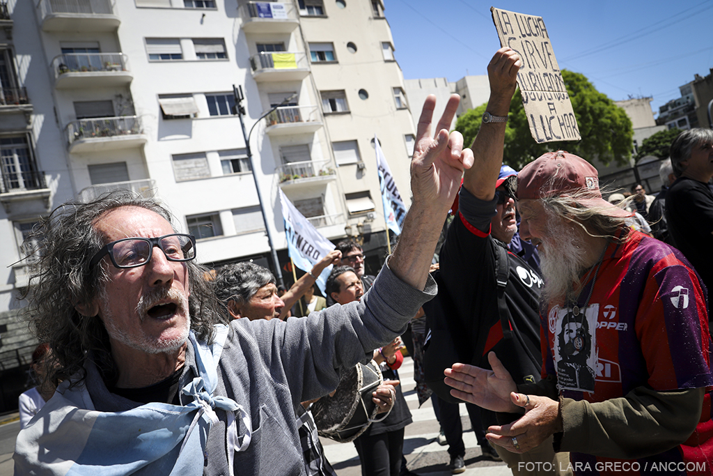 En la Facultad de Ciencias Sociales, Fernando Signorini abraza a Fabián Grillo, padre de Pablo, el fotoperiodista herido por la represión de la marcha a los jubilados.